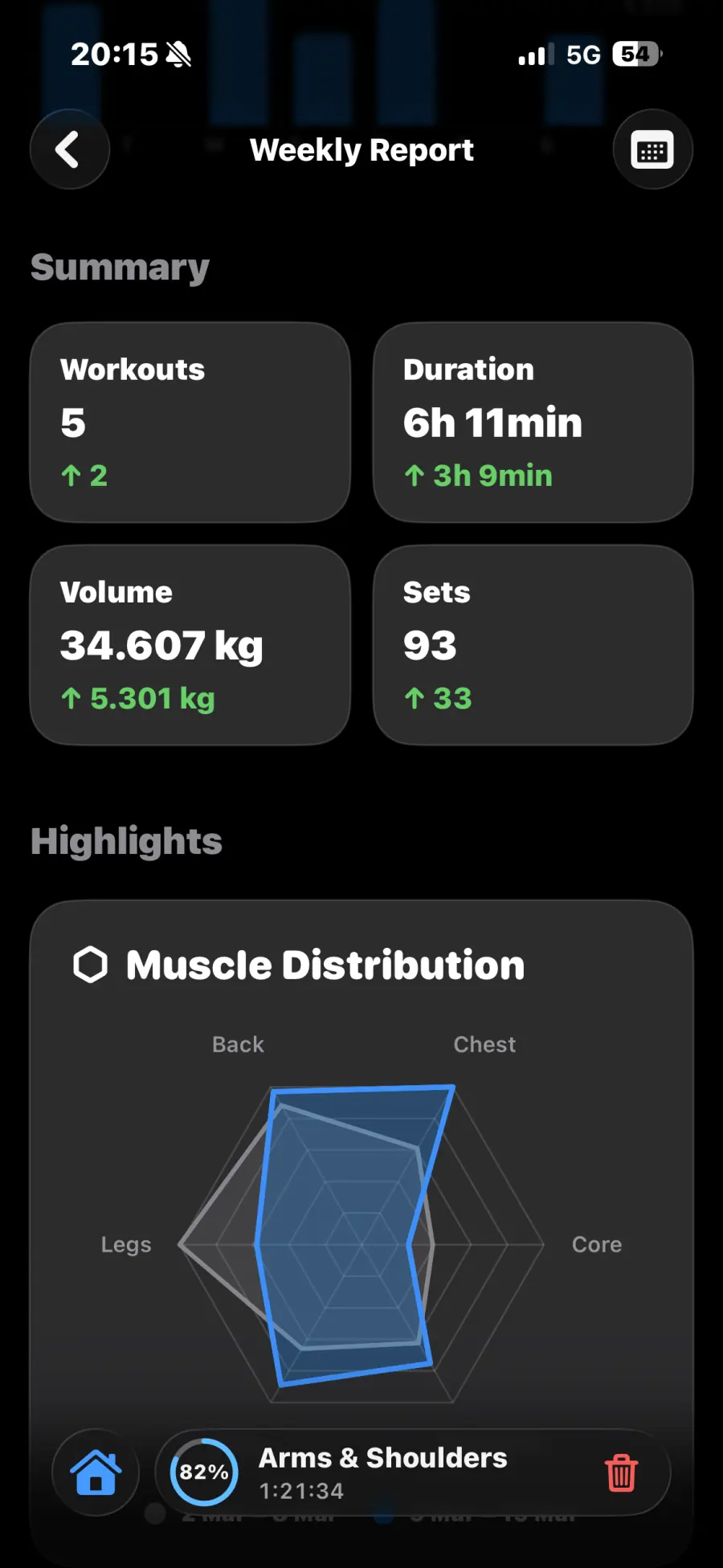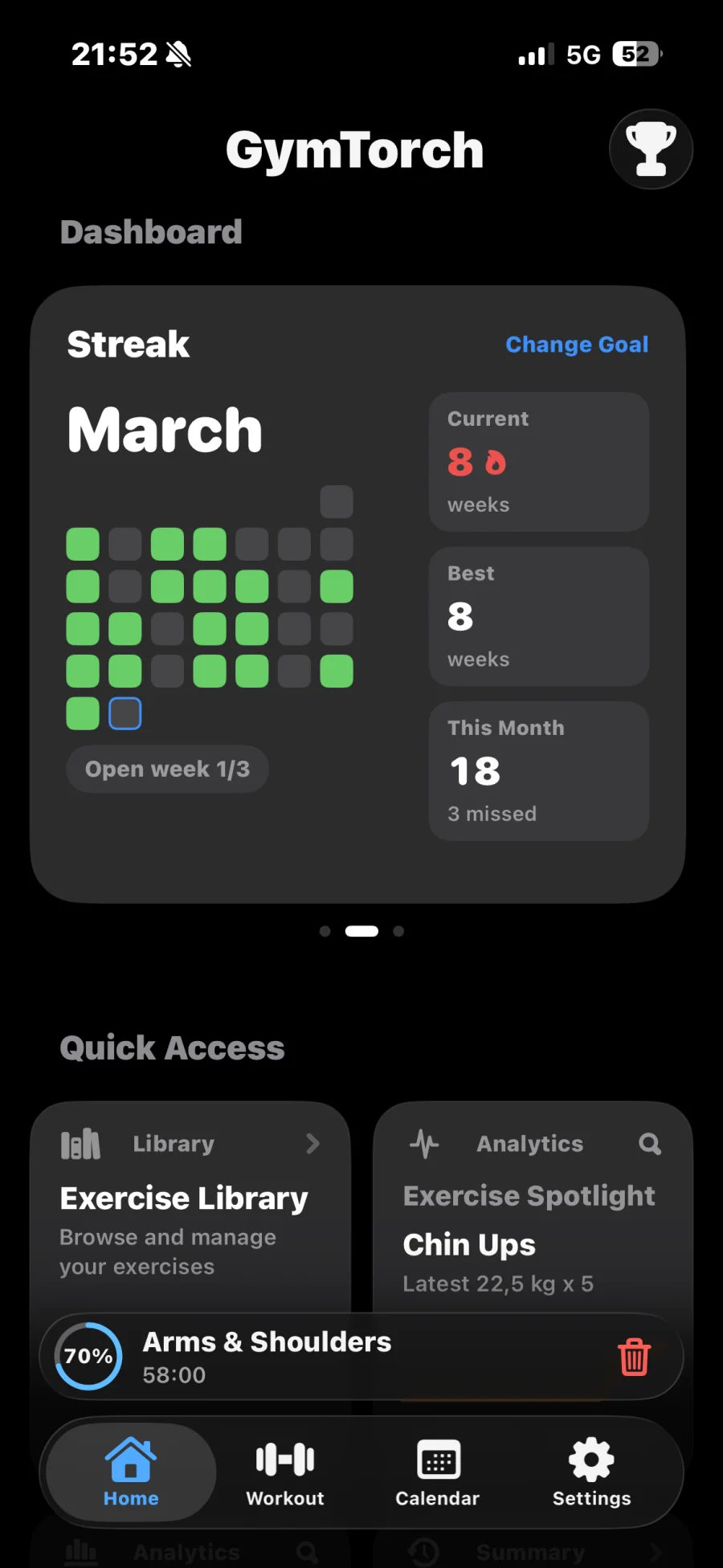Streaks, volume trends, and today's session — all before your first rep.